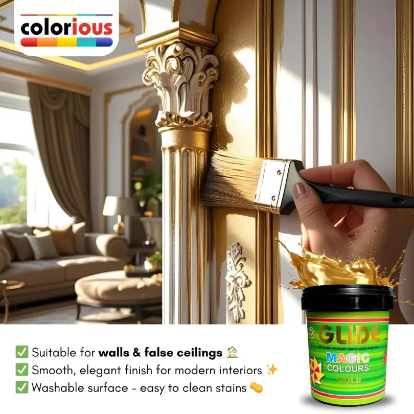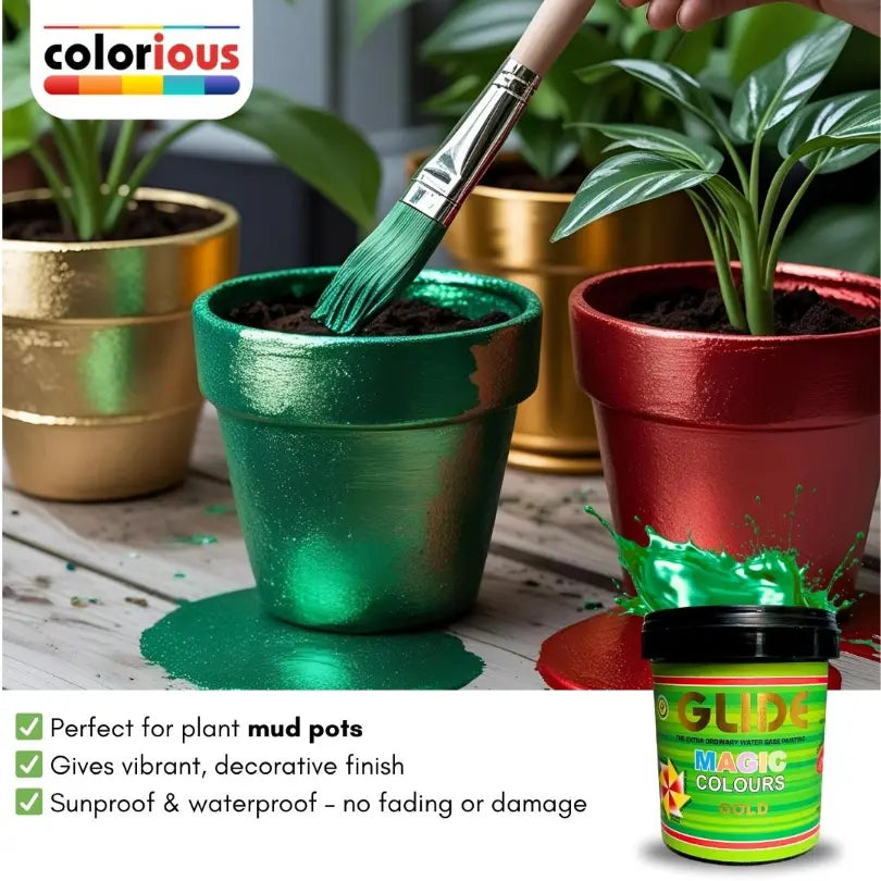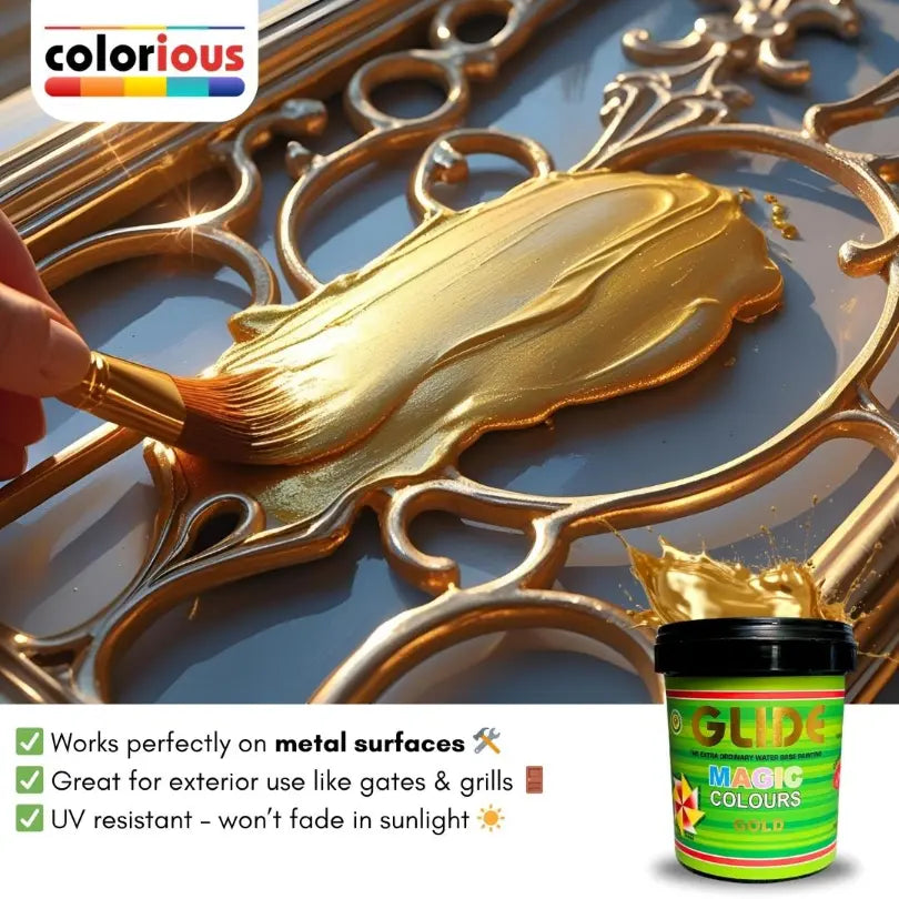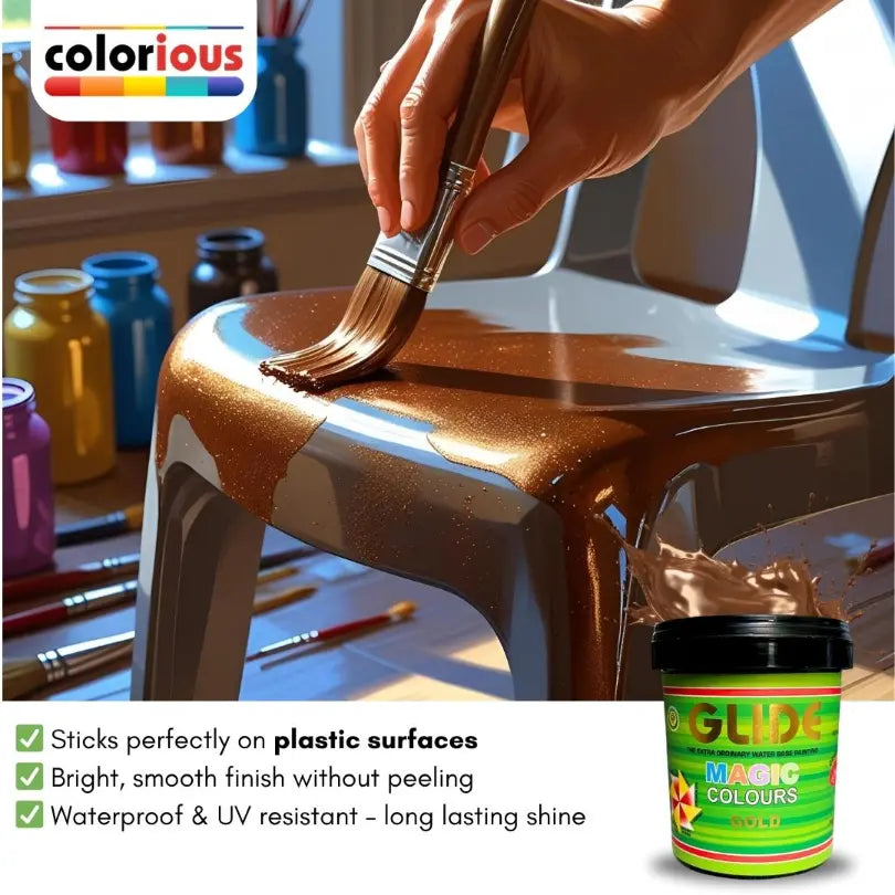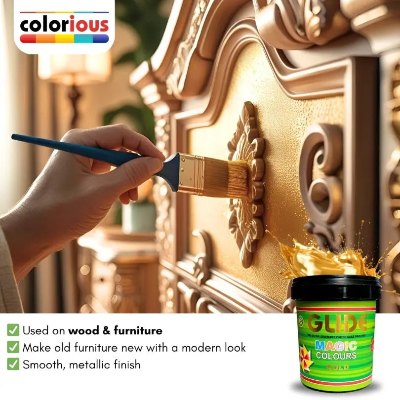 Bring life back to your old décor with Glide Magic Colours, a shiny water-based metallic paint that adds a magical touch to any surface! Perfect for DIY lovers, hobbyists, and home decorators who want to refresh furniture, décor items, or walls without breaking the bank.